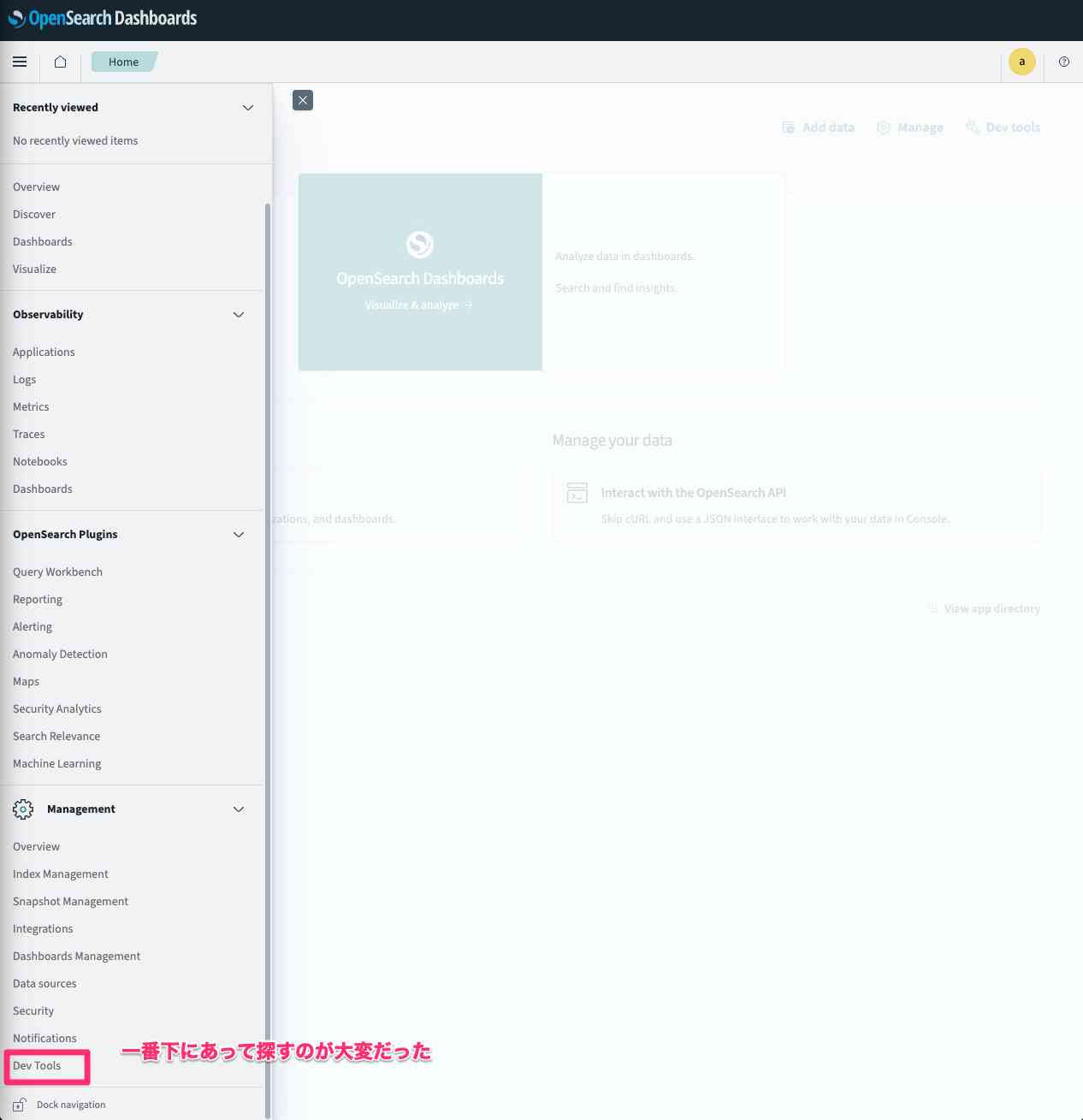 左側のナビゲーションパネルから[Dev Tools]を開きます。