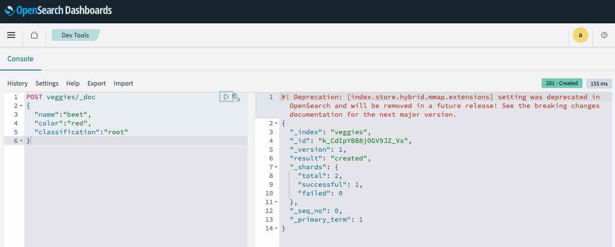 PUTリクエストはfruitという名前のインデックスを作成し、IDが1である単一のドキュメントをインデックスに追加する。次のレスポンスが生成される。
