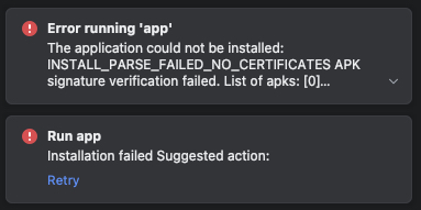 The application could not be installed: INSTALL_PARSE_FAILED_NO_CERTIFICATES APK signature verification failed. List of apks: [0] ‘/Users/xxxxxxxx/hoge/app/build/intermediates/extracted_apks/release/extractApksFromBundleForRelease/base-en.apk’ [1] ‘/Users/xxxxxxxx/hoge/app/build/intermediates/extracted_apks/release/extractApksFromBundleForRelease/base-arm64_v8a.apk’ [2] ‘/Users/xxxxxxxx/hoge/app/build/intermediates/extracted_apks/release/extractApksFromBundleForRelease/base-xxhdpi.apk’ [3] ‘/Users/xxxxxxxx/hoge/app/build/intermediates/extracted_apks/release/extractApksFromBundleForRelease/base-master.apk’