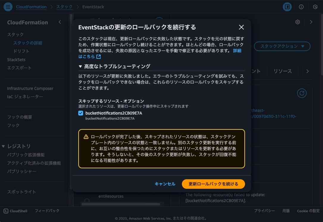 cdk deployする前に前回失敗したイベント更新を復旧しておきます。