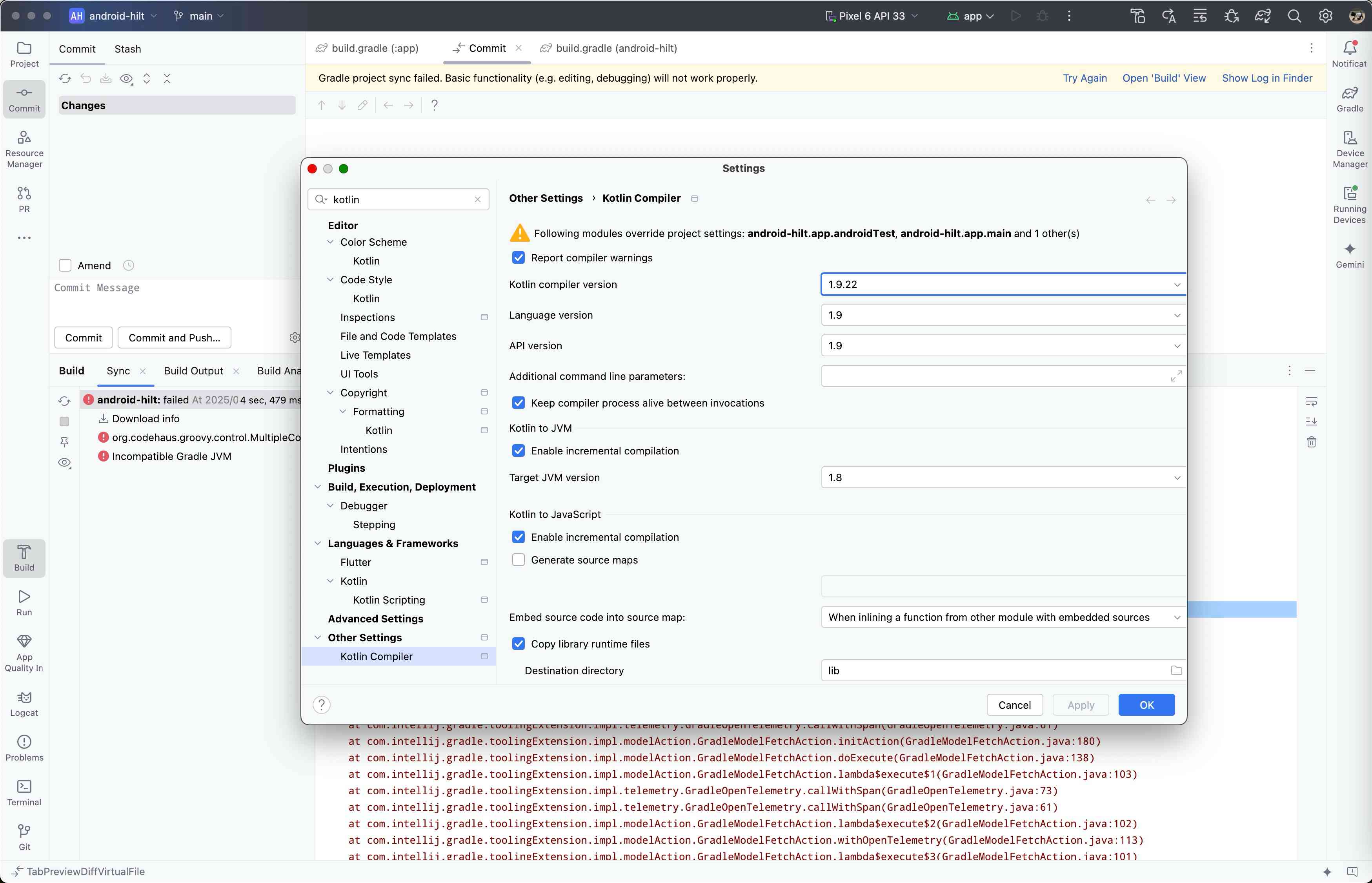 kotlinのversionを1.9.22にすると直るという情報があったので、kotlinコンパイラのバージョンアップを試した。