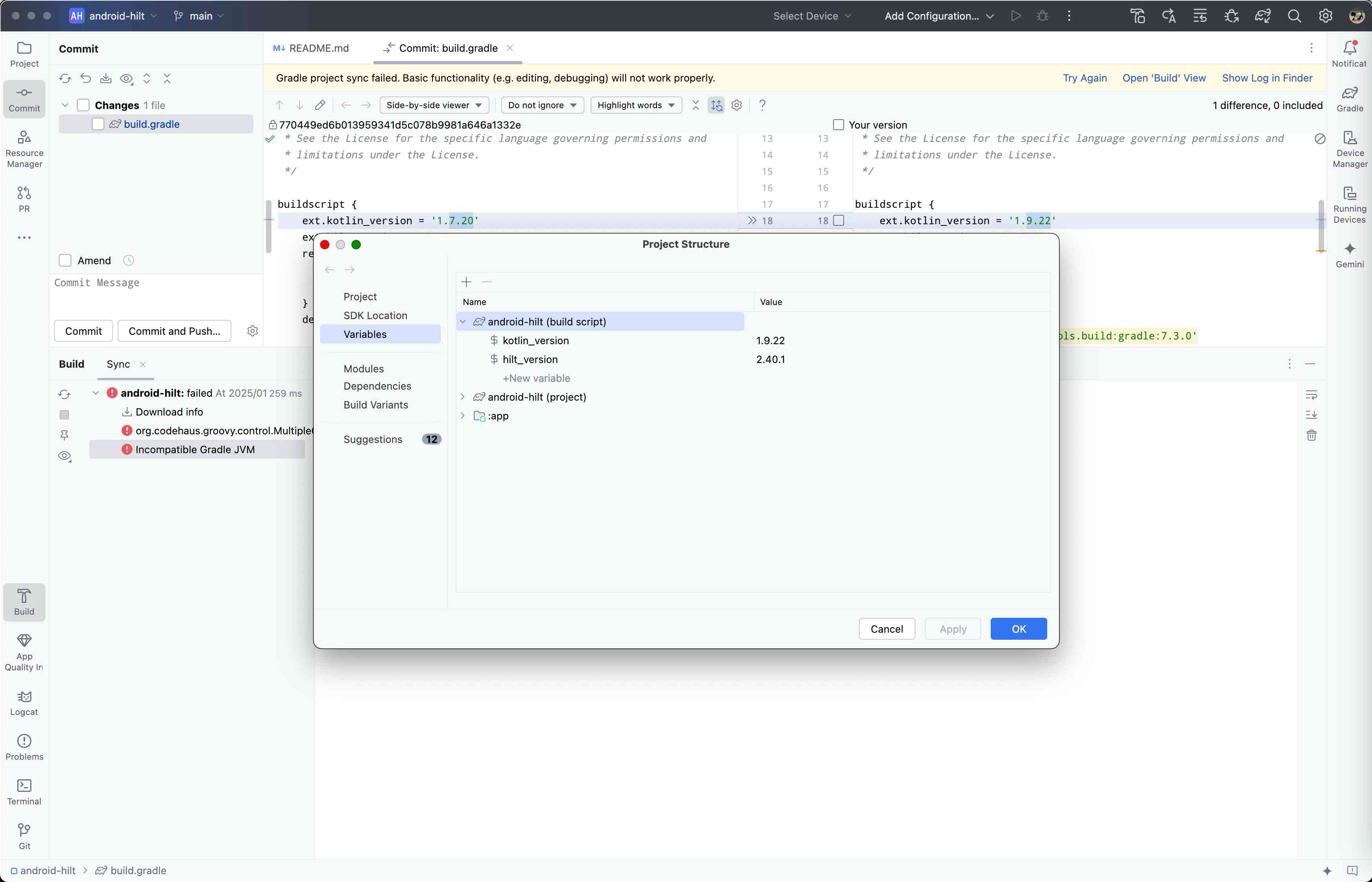 File -> Project Structure の Variable の android-hilt(build-script) の $kotlin_versionを設定する。