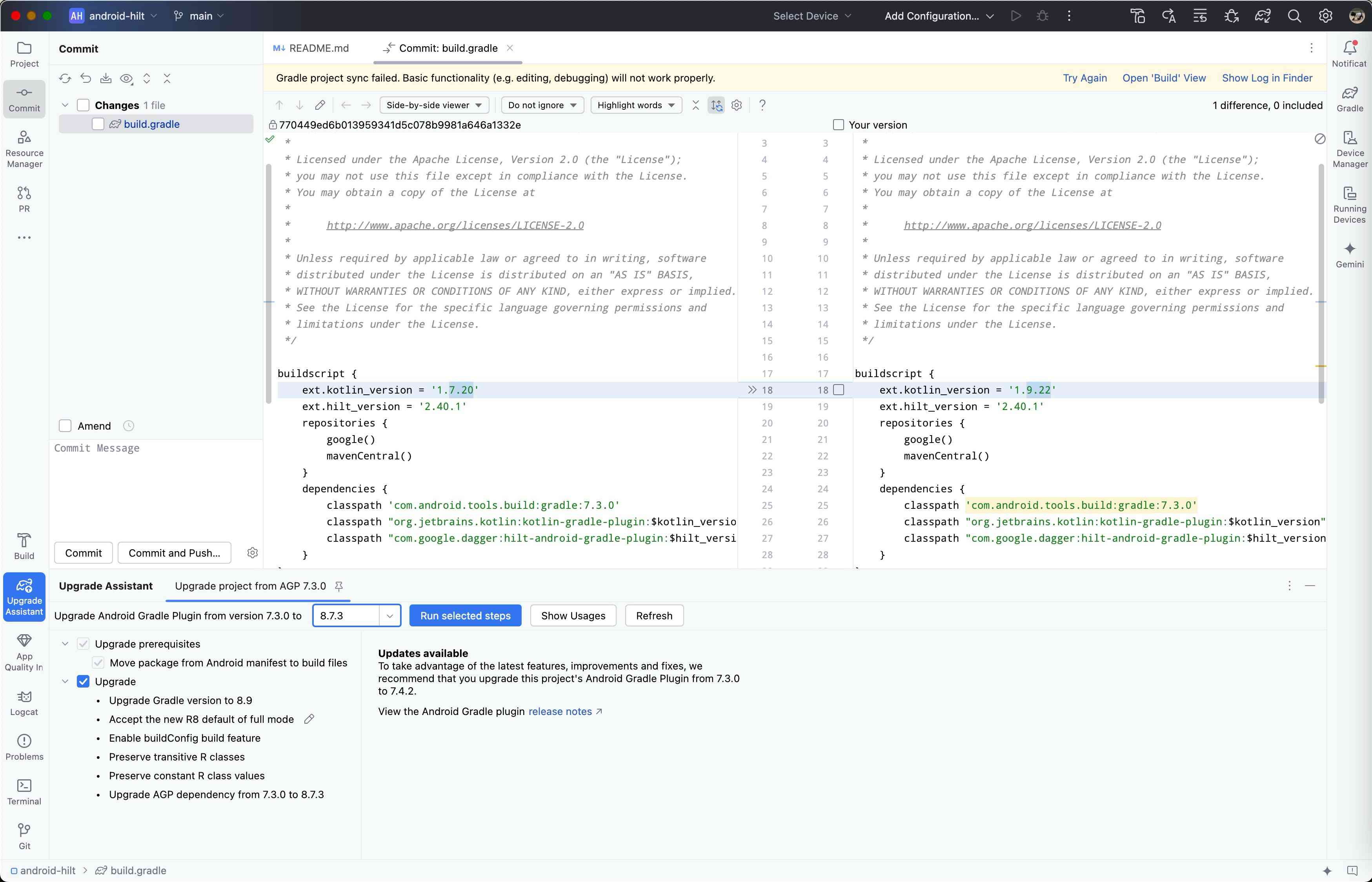 Tools -> AGP Upgrade Assistant を開き、8.7.3にして、「Run selected steps」を実行。