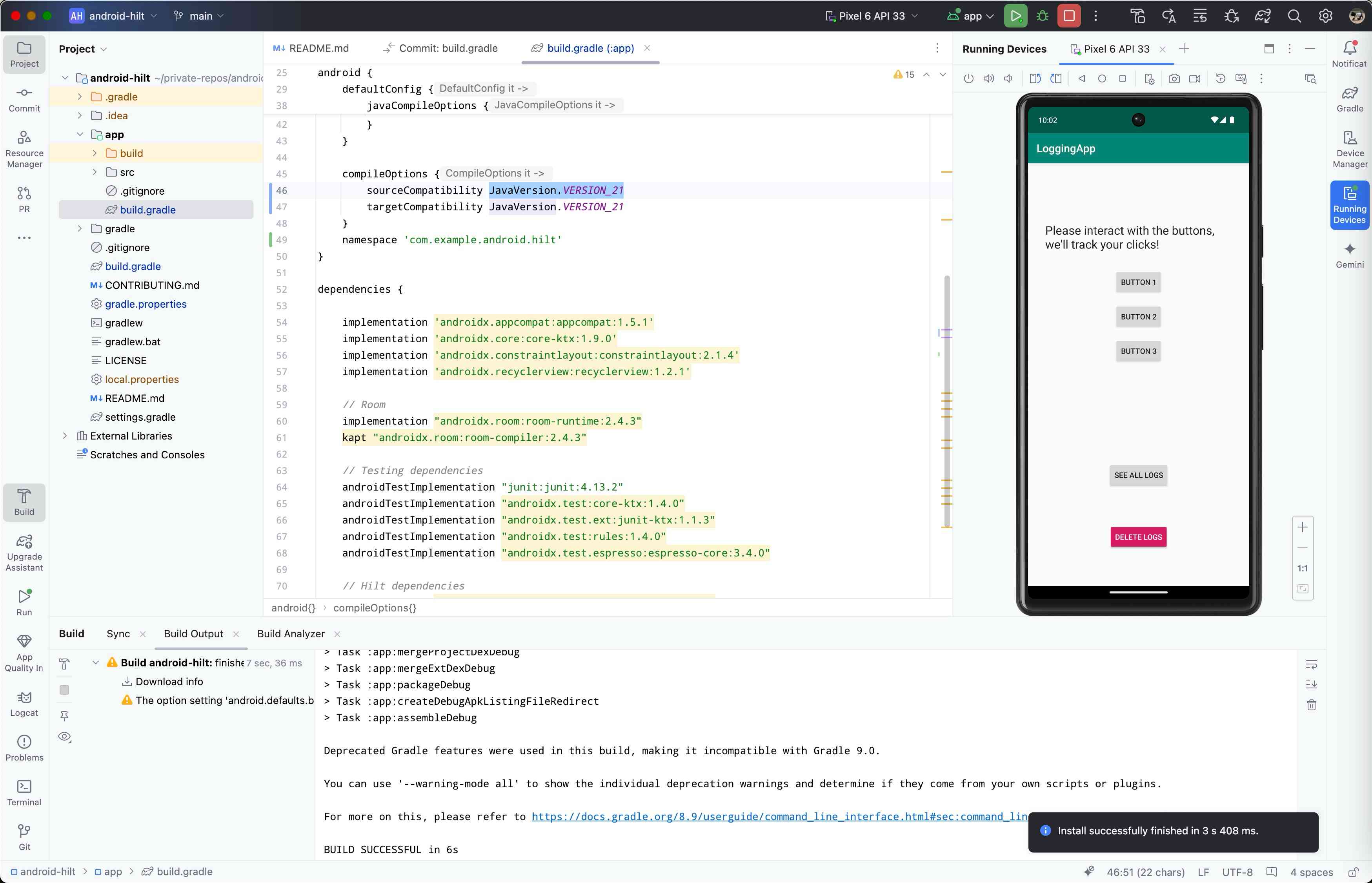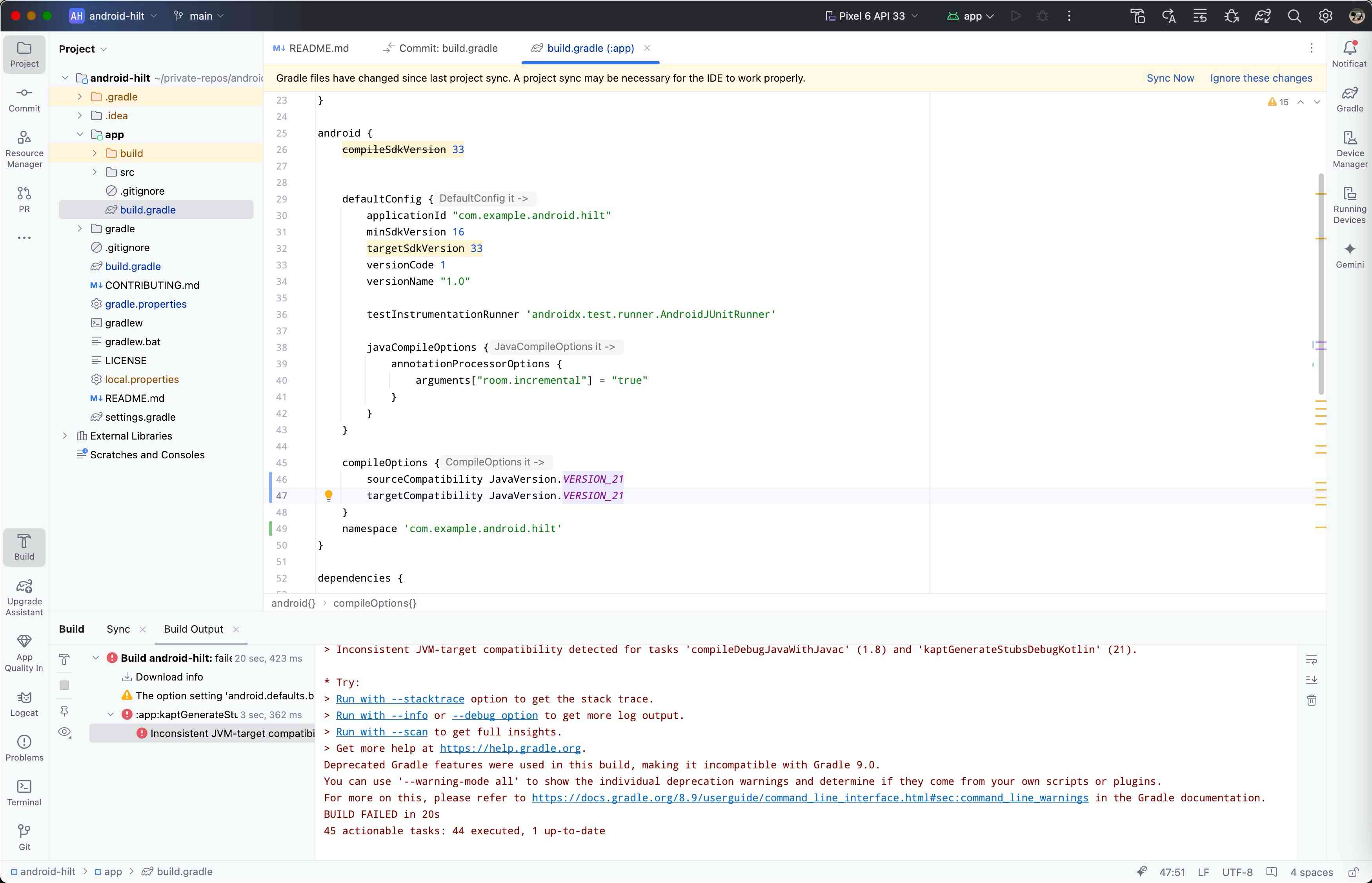appのbuild.gradleのcompileOptionsでJavaVersion.VERSION_21を指定して、「Sync Now」を実行