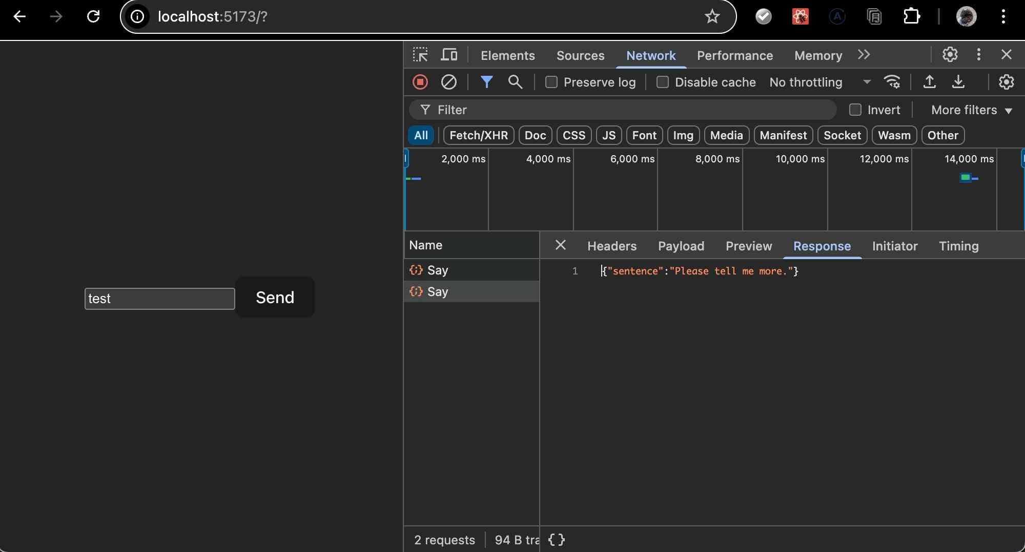 これでサーバーと最小限のコミュニケーションが取れるようになりましたが、何も表示しません。developer toolsでみるとELIZAが “Please tell me more” と言っているのがわかります!
