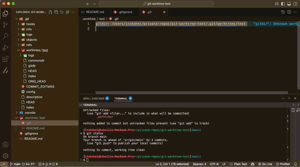 VSCodeのSOURCE CONTROLには./testは表示されないのですが、これはVSCode側の事情があるのかもしれません。コード検索時も困りそうなので、最初からディレクトリは分けて、.gitignoreの対象にしたり、検索対象外にしたほうが良さそうです。ということで.worktreeというディレクトリの下に作り直してみます。.gitignoreに.worktreeを追加します。