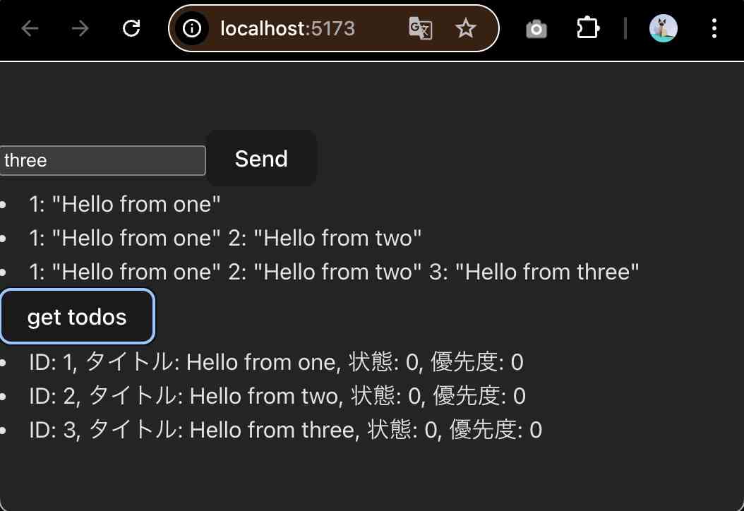 以下のようなFEになりました。formに入れたメッセージはバックエンドで、変換・結合されてformの下に出力されています。get todosボタンを押すと、現在データベースに保存されているデータを全て取得してボタンの下に表示しています。