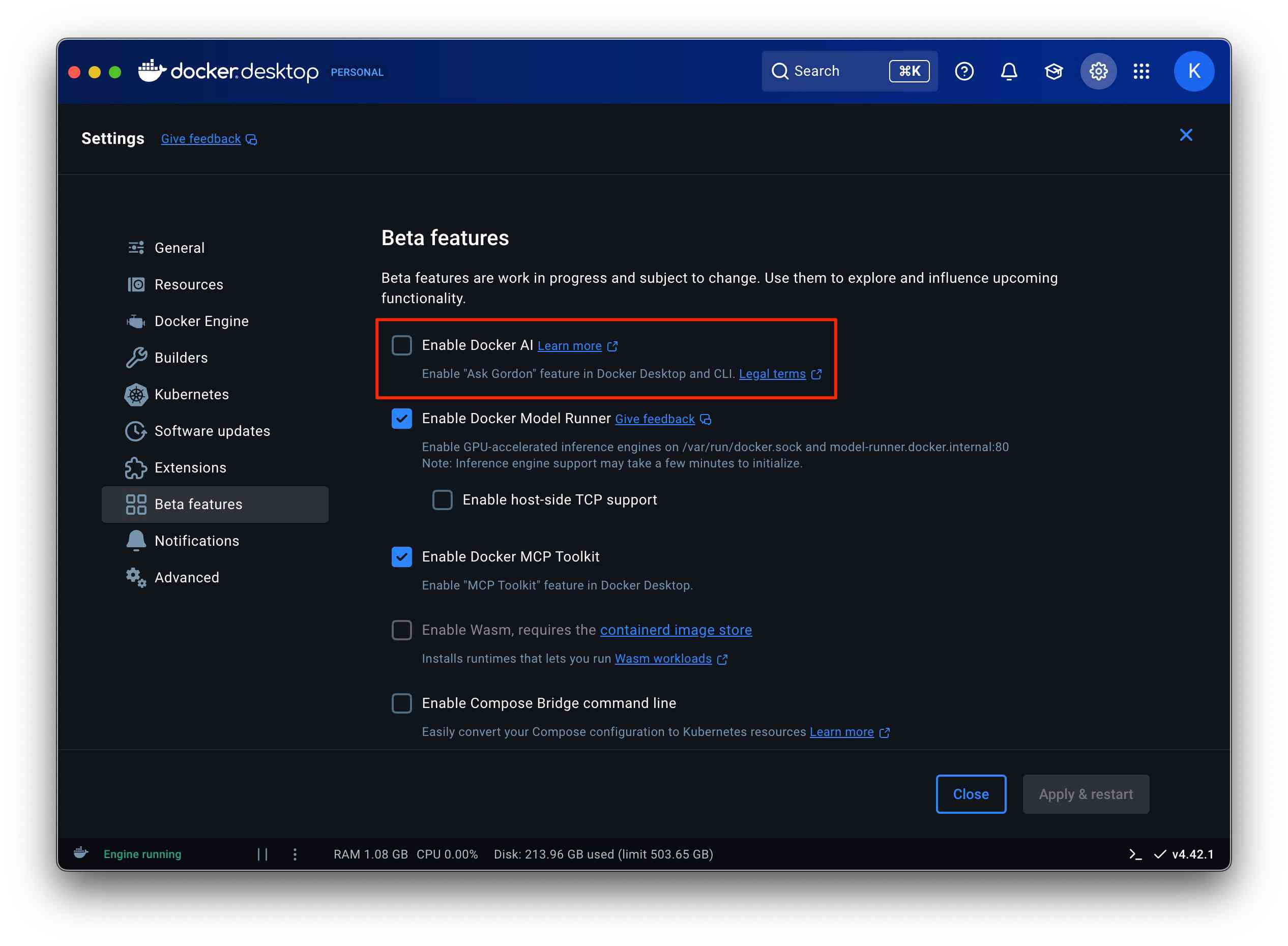 - Docker Desktopの設定から Beta features を選択します