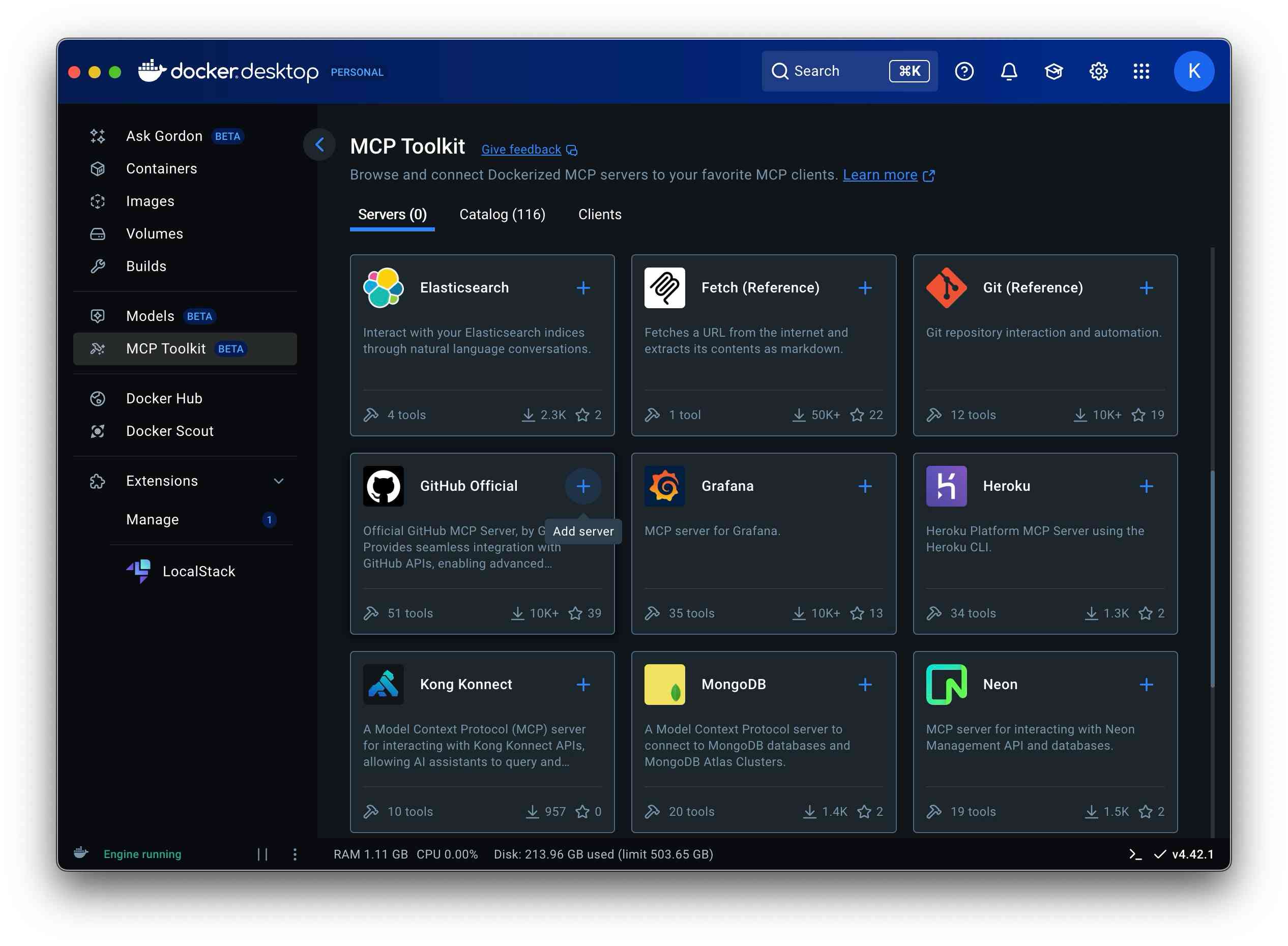 Docker DesktopのDockerMCPカタログから 直接MCPサーバーを探して起動できます。 - マニュアル無しのセットアップ: 依存関係の管理や設定は必要ありません。