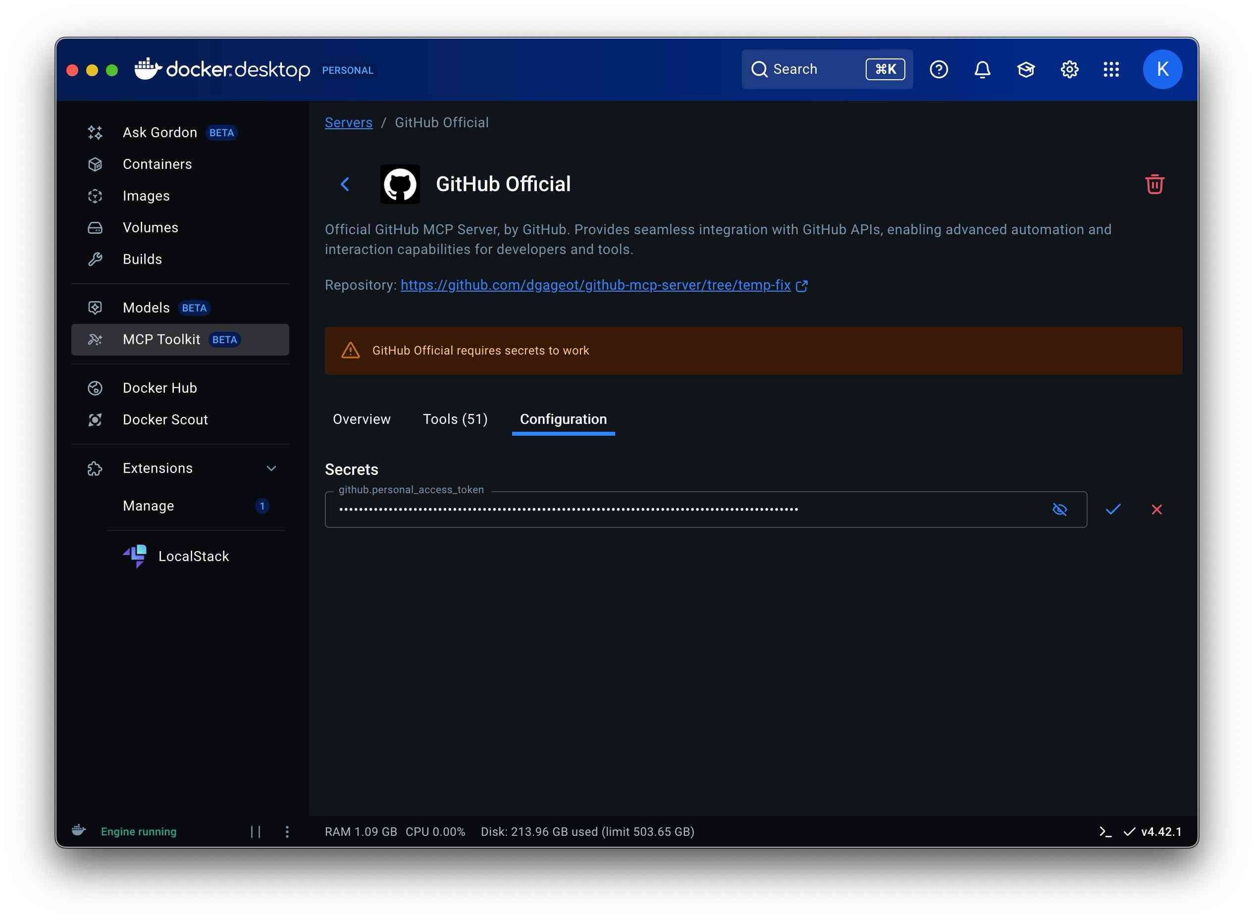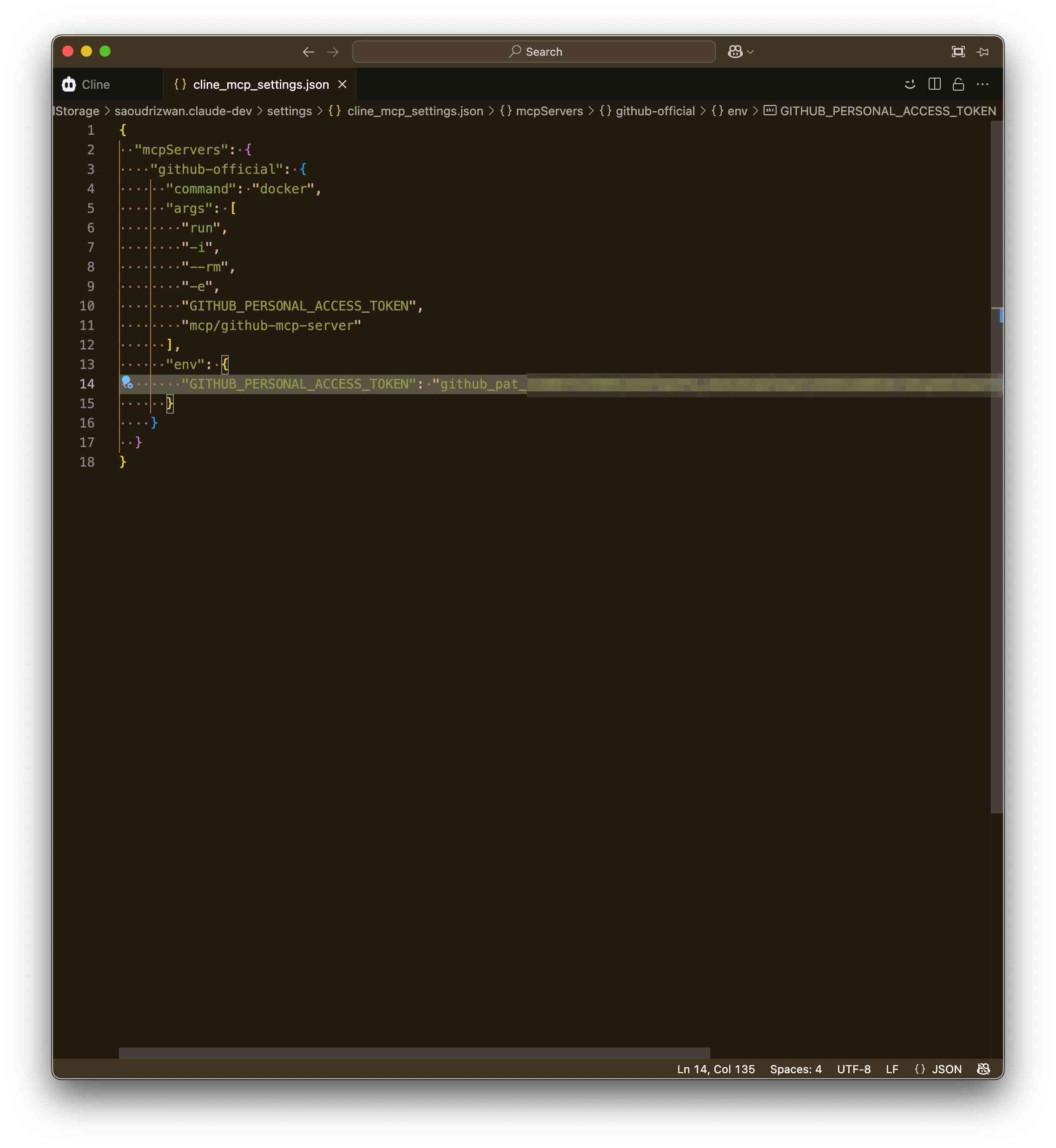 "GITHUB_PERSONAL_ACCESS_TOKEN": "<YOUR_TOKEN>"