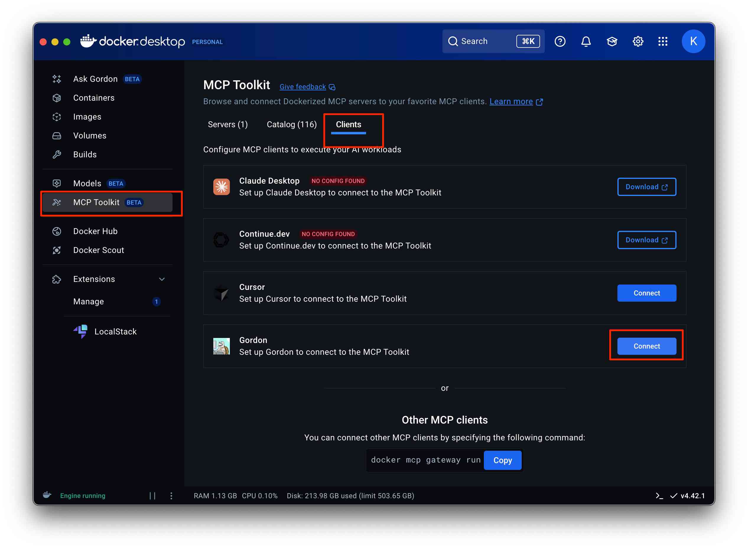 MCP ToolkitのメニューからClientsタブを選択し、Gordonを接続します。