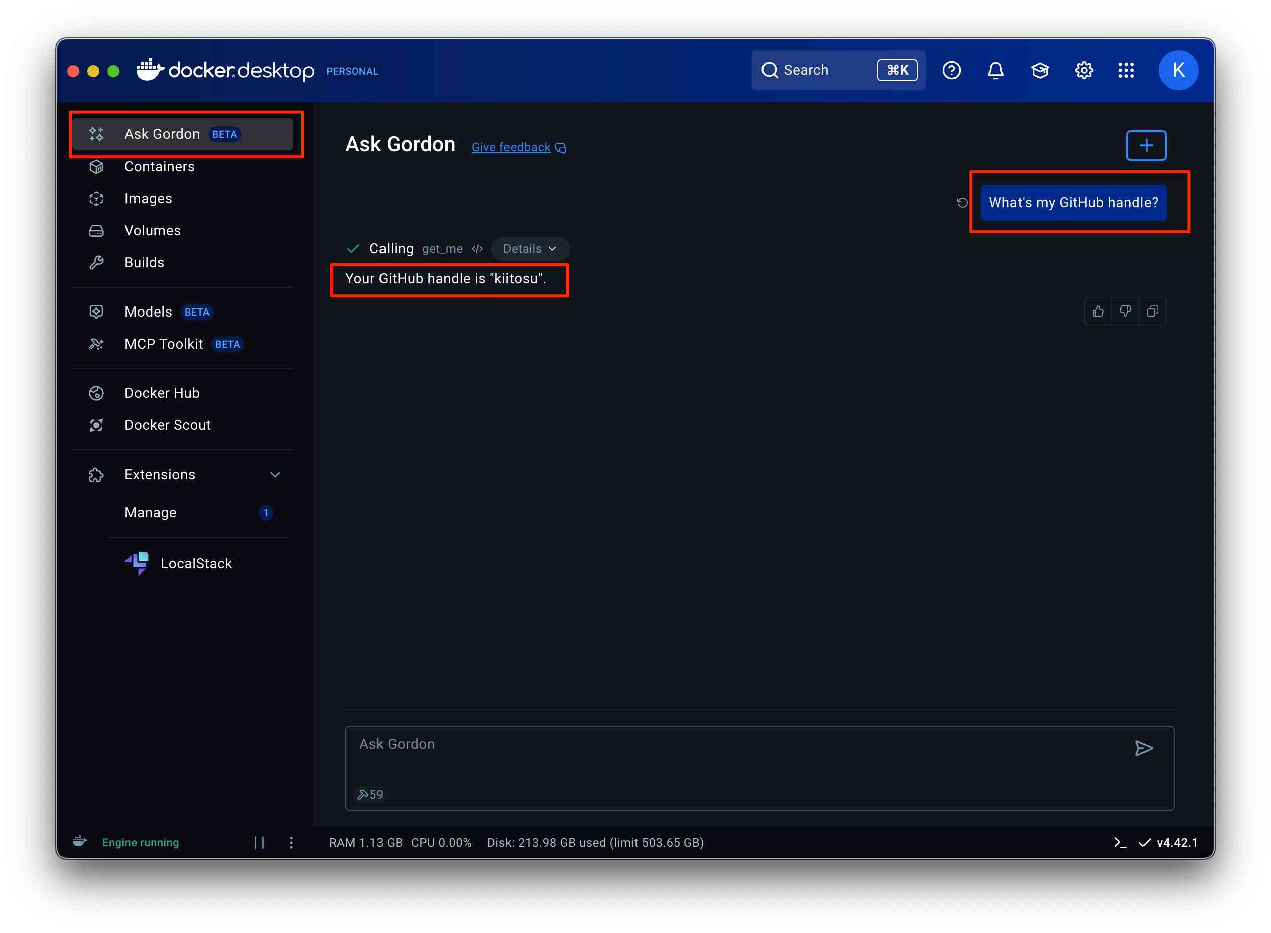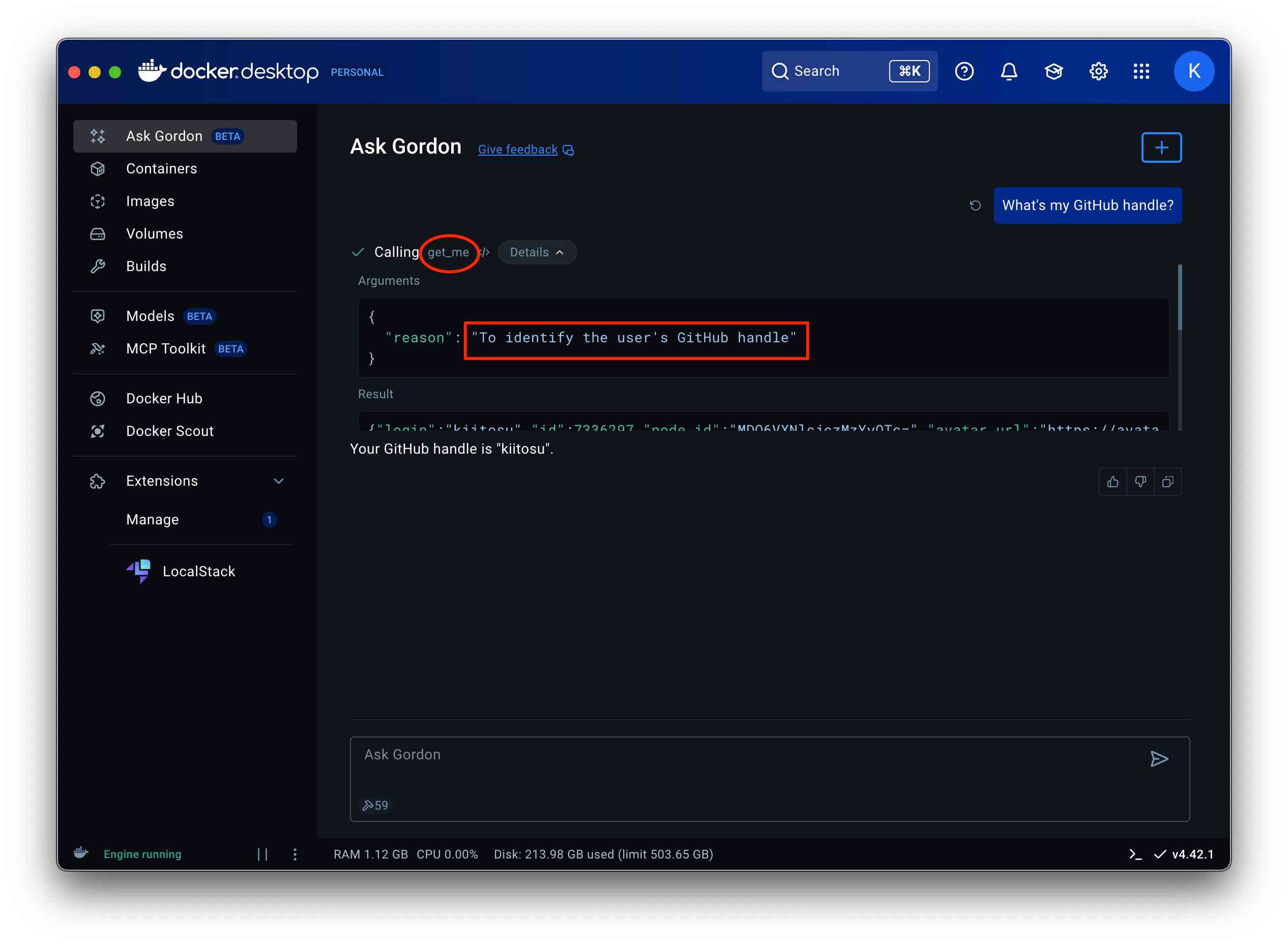 改めて What's my GitHub handle? と聞いてみると、ちゃんとハンドルネームを返してくれました!