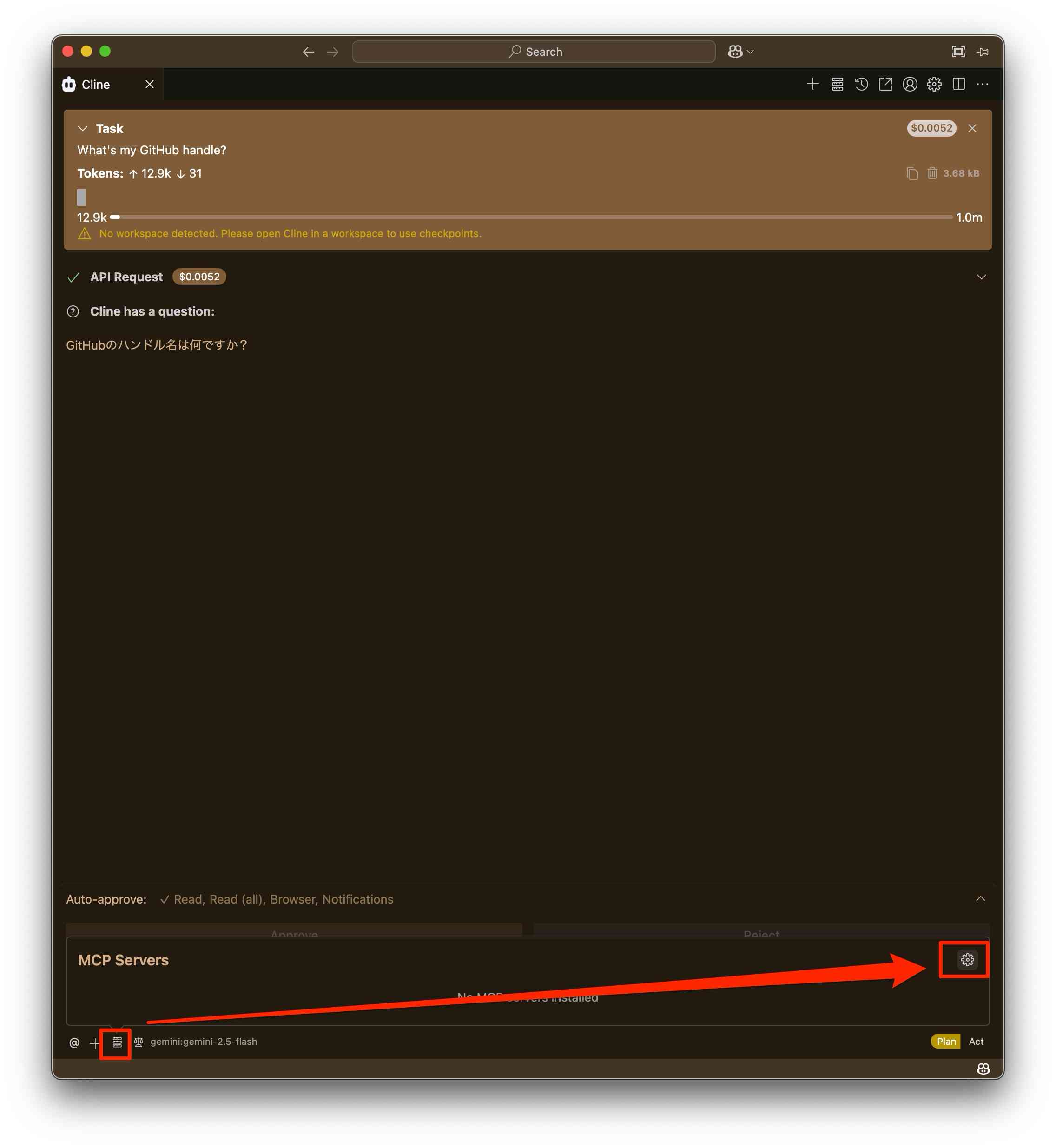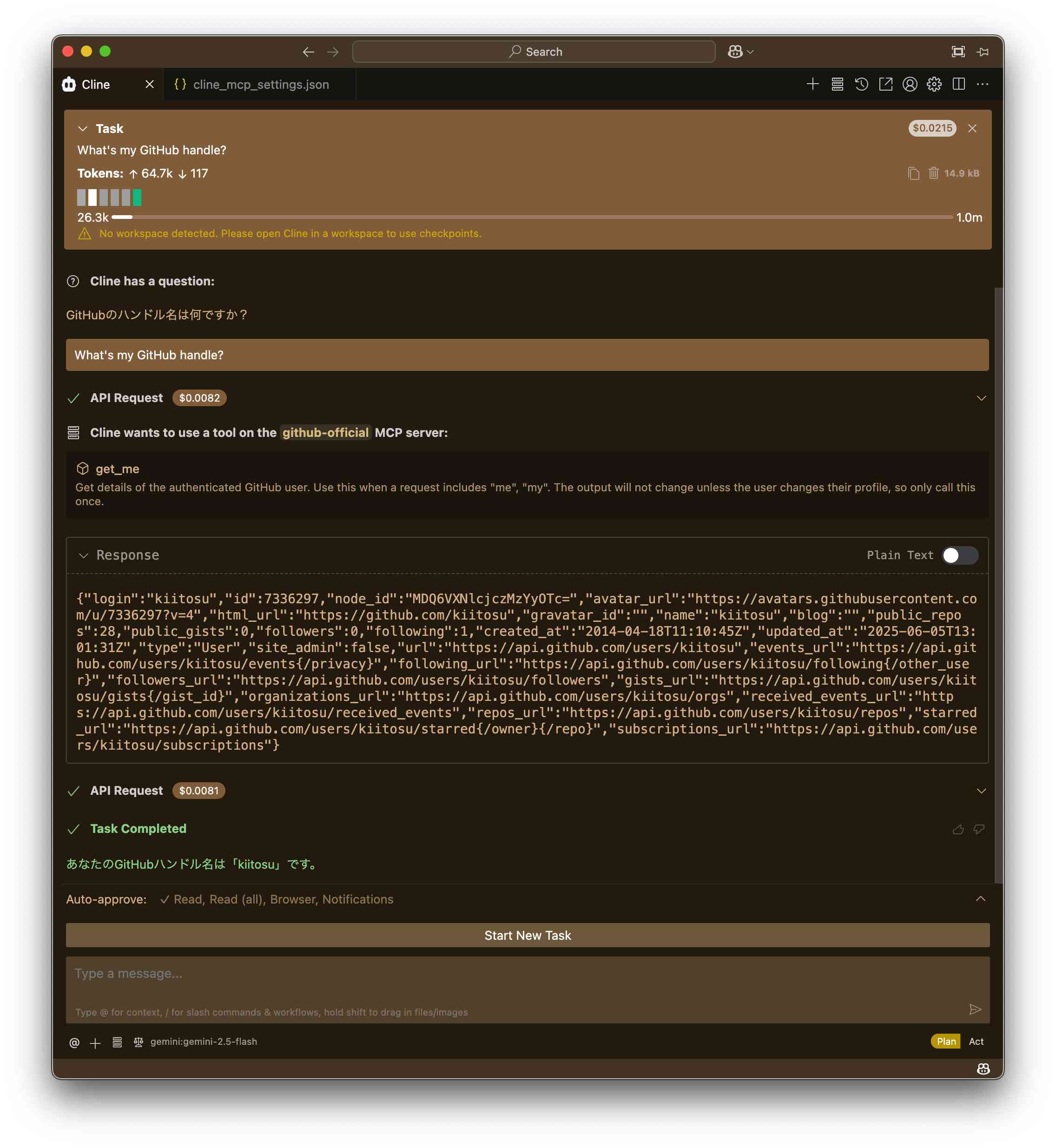 GitHubのハンドル名は何ですか? と回答が来ました。.clinerules で日本語回答を依頼しているので、翻訳して満足してしまったのでしょうか。