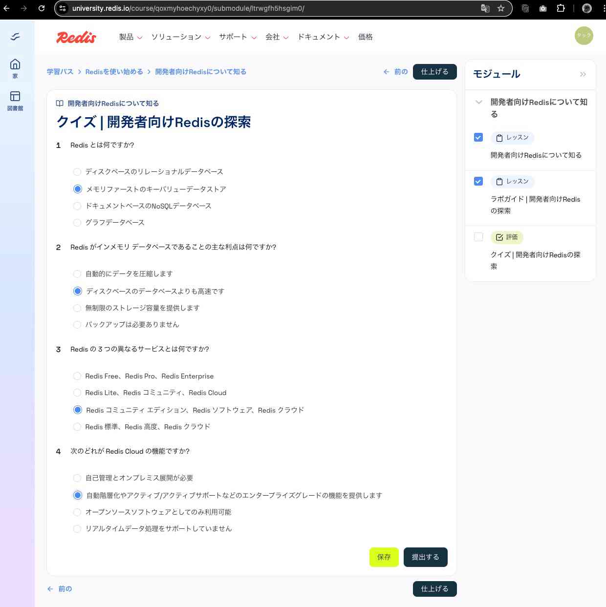 「Introduction to Redis for AI」とか気になりますね。ただ、今回は初回勉強ということで、「Get started with Redis」をやってみます。日本語字幕がないのがちょっときついですね。