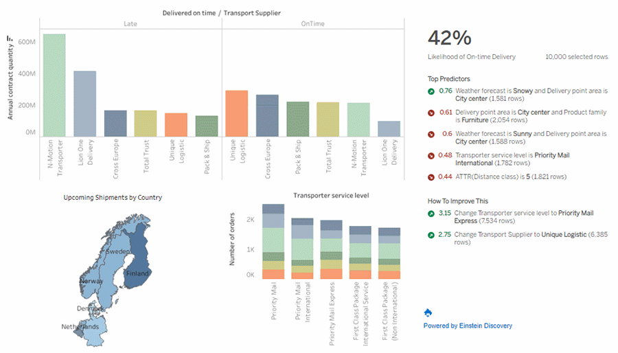 信頼性と透明性のある予測や推奨事項が誰でも得られます。 Tableau でリアルタイムの予測を表示します。ダッシュボードの拡張機能は、Tableau ワークブックのソース データで Einstein Discovery 予測モデルを使用して、予測をインタラクティブに、かつオンデマンドで生成します。