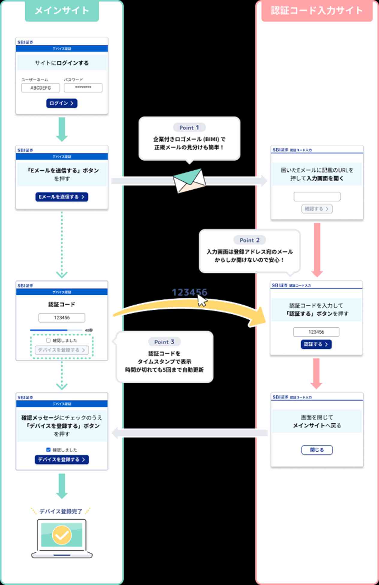 ※メインサイト (PC、スマホ)のデバイス認証画面に表示される「認証コード」は40秒間隔で5回まで更新されます。
